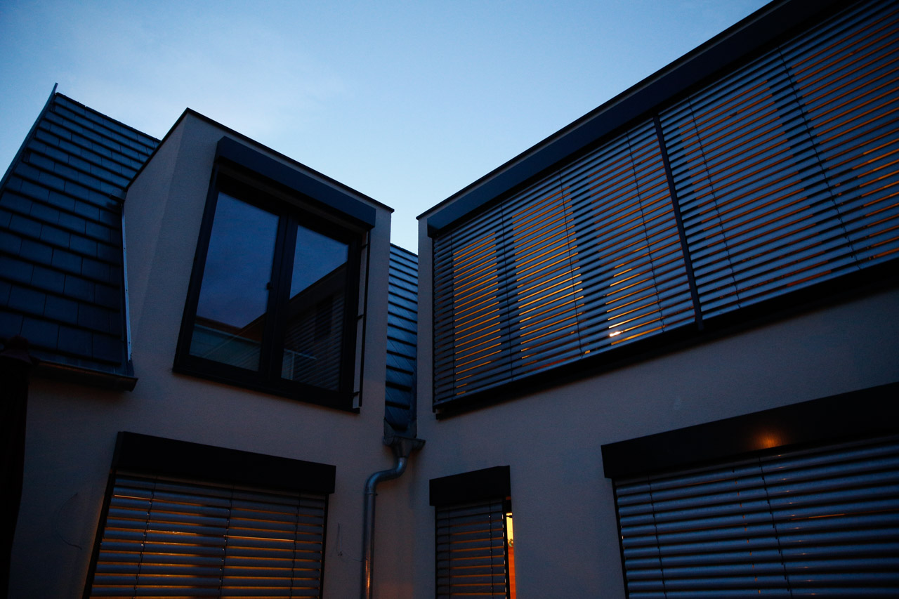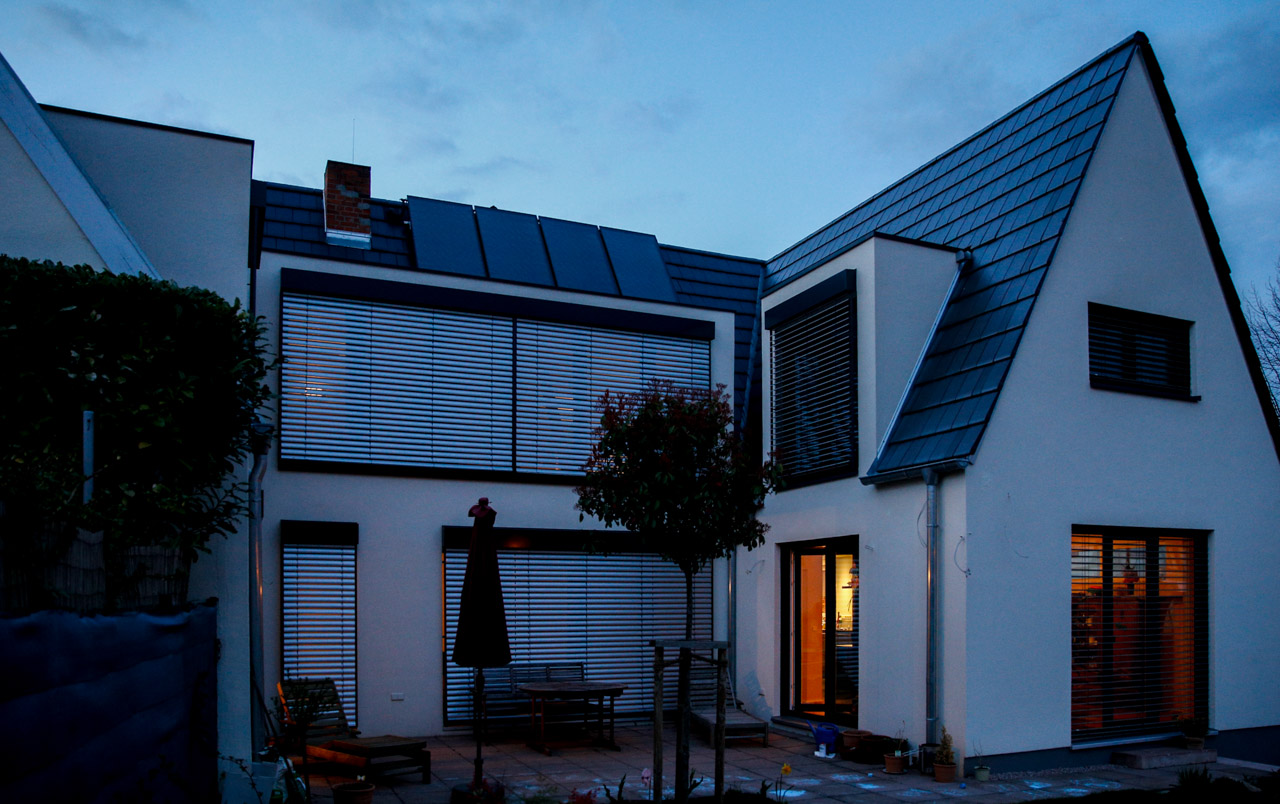 Die Verwendung von abgetönten Fensterrahmen, dunkler Dacheindeckung und hellem Außenputz wurde ein modernen Charakter erzeugt. Das Gebäude fügt sich harmonisch in die vorhandene Bauweise ein.